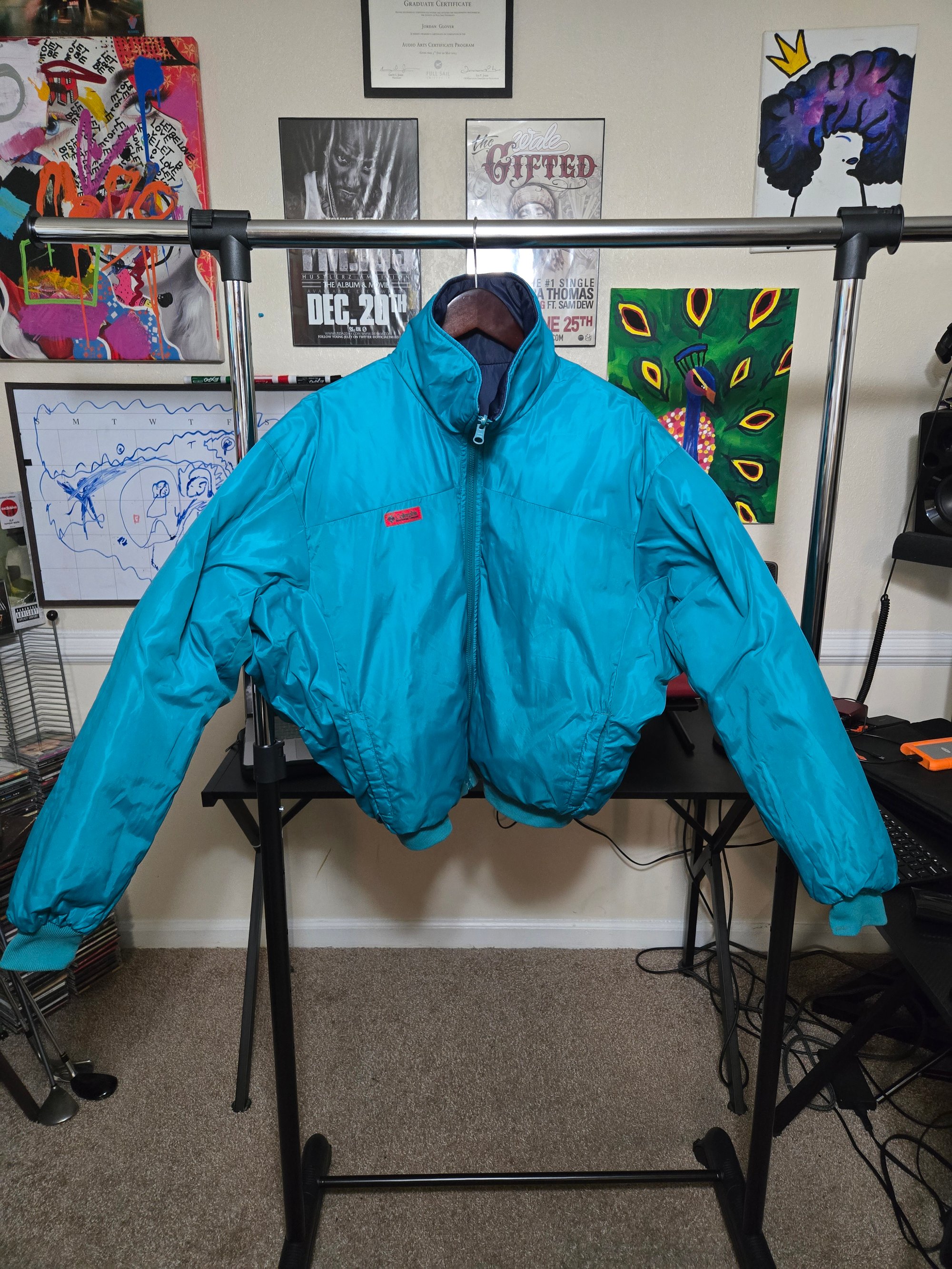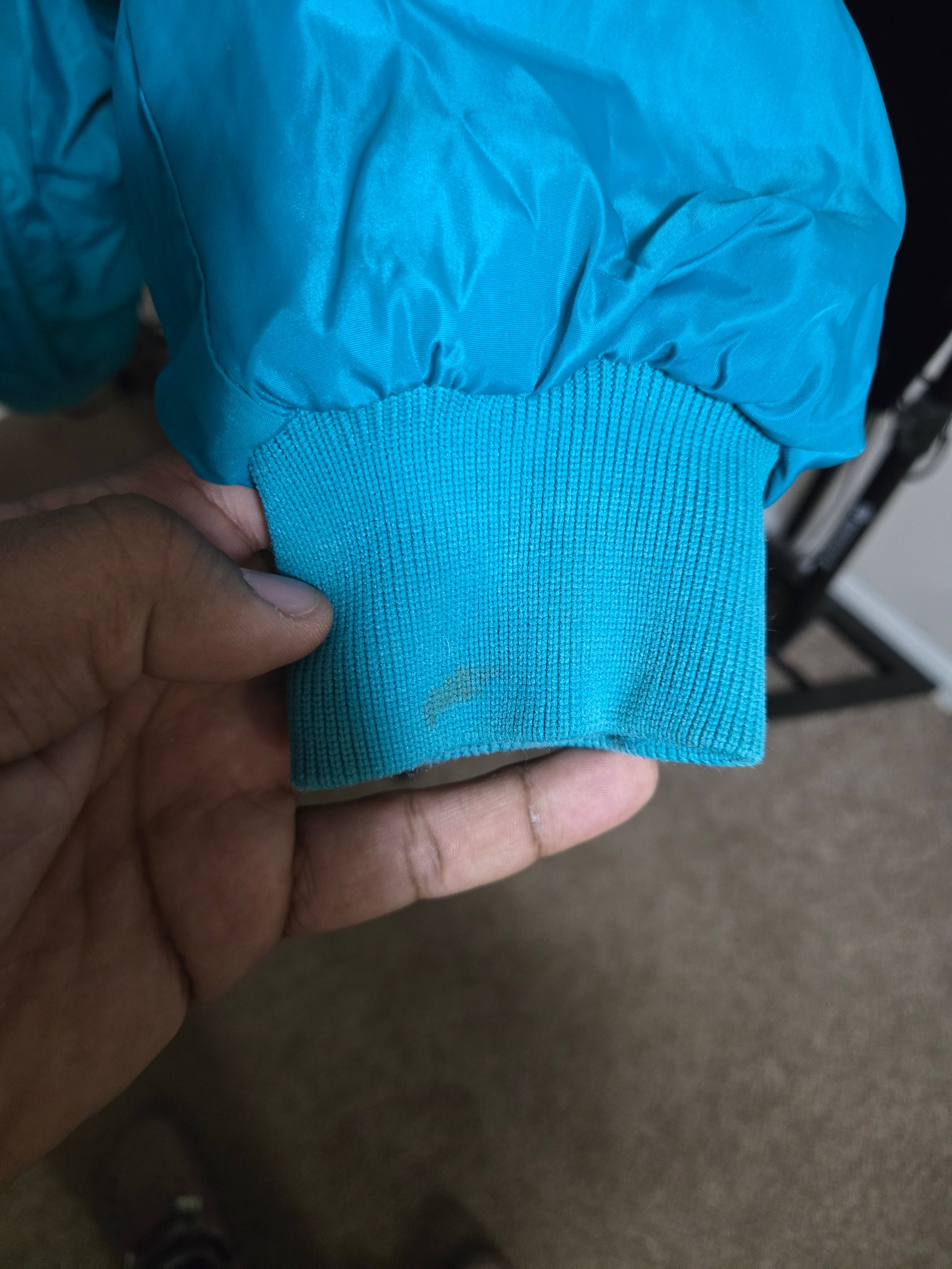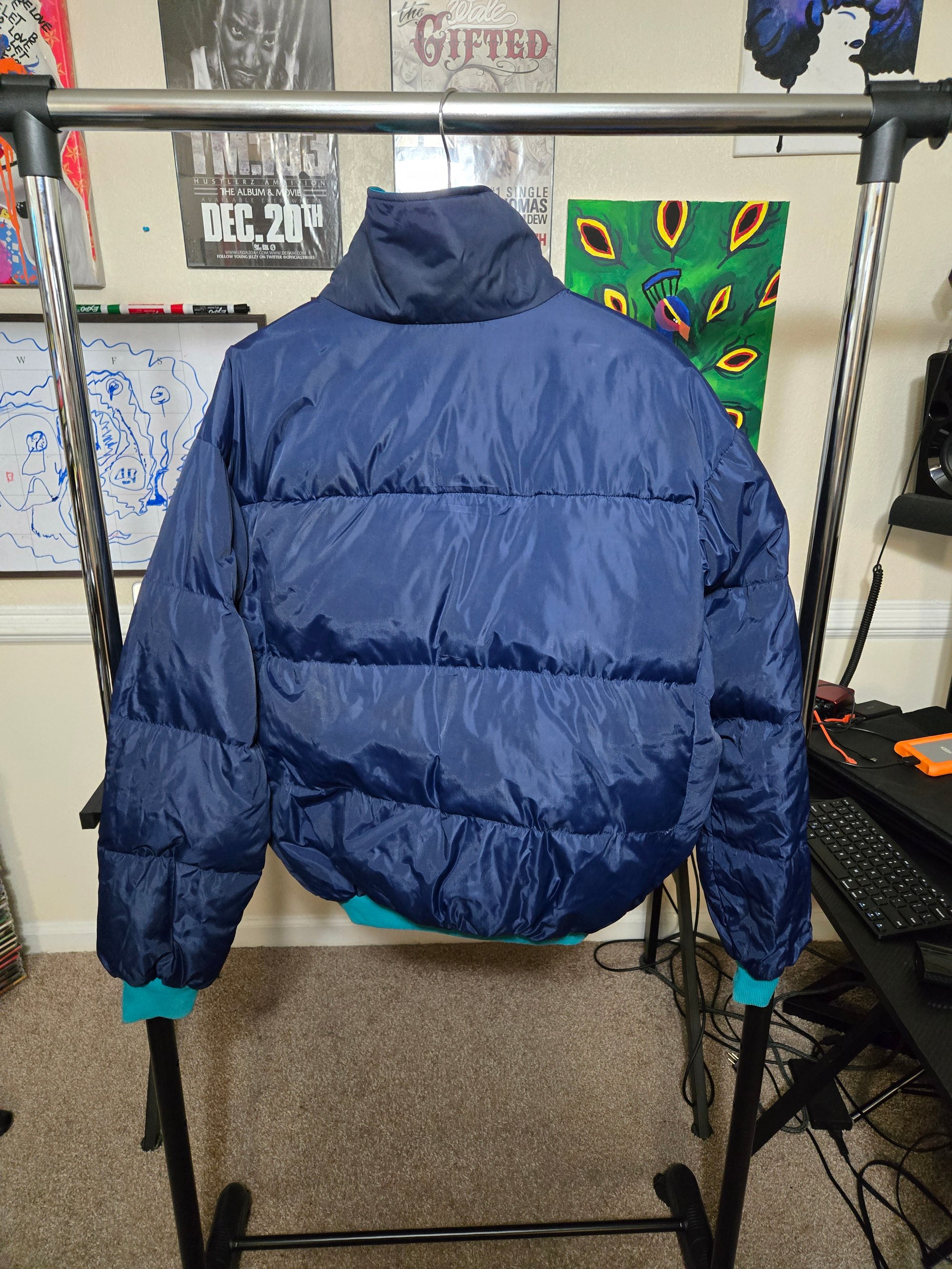 This is a vintage puffer coat, this is from the 90s but has been well taken care of. There are a couple of points where it has been stained. They are pictured. The jacket fits like a men's XL.