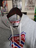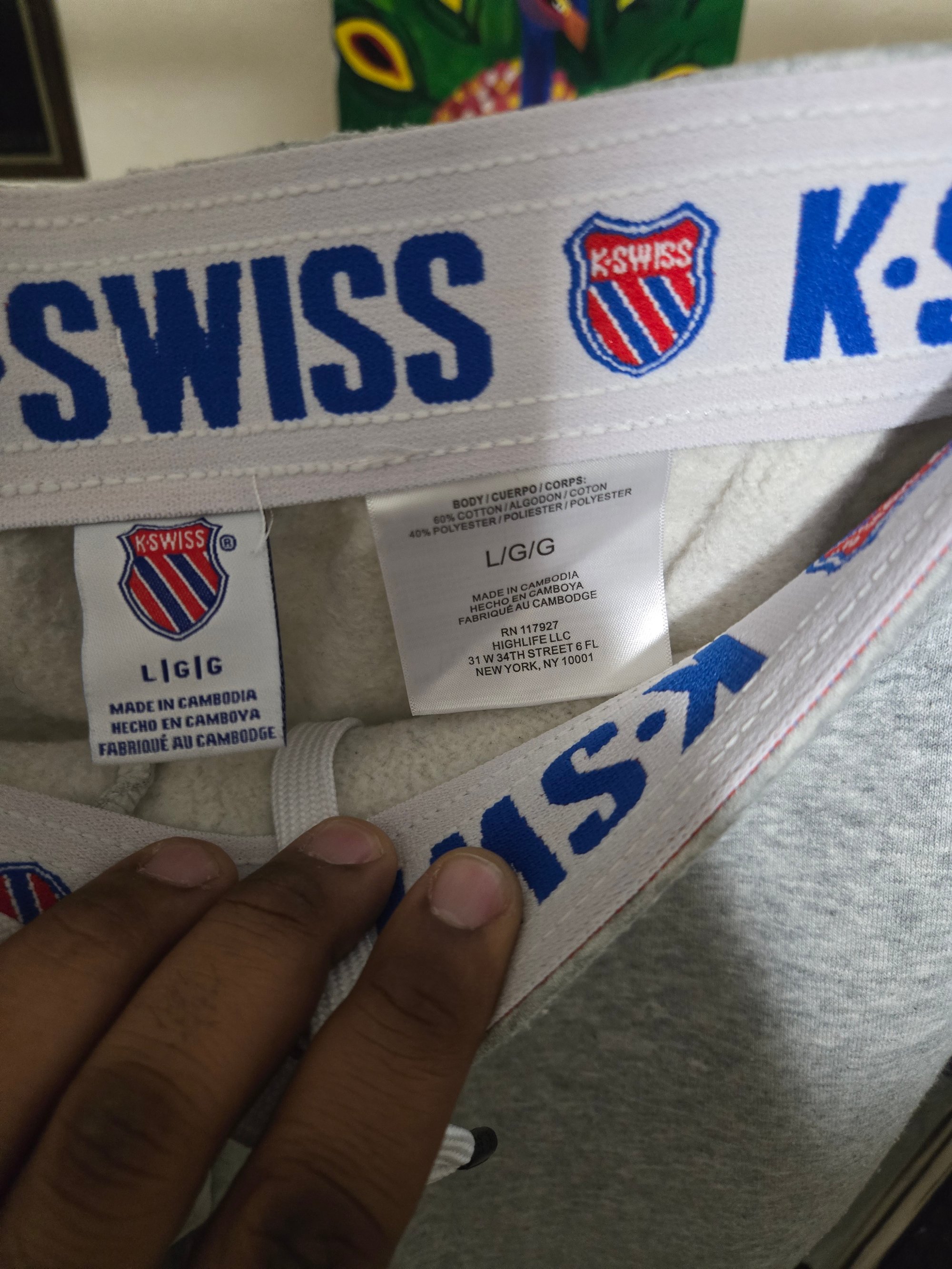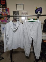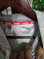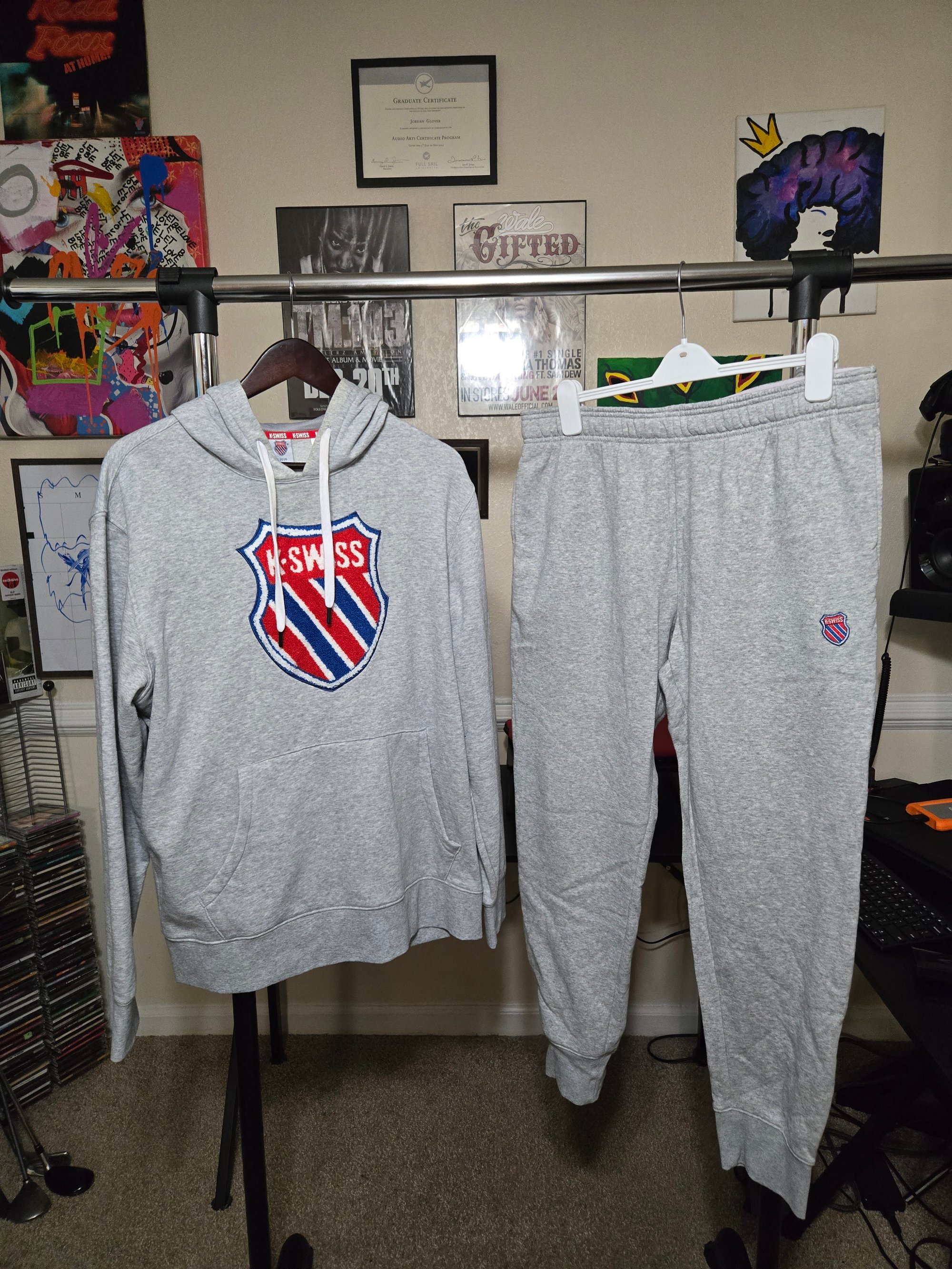 this is a men's large sweatsuit from K Swiss. There is a little discoloration but price reflects it.