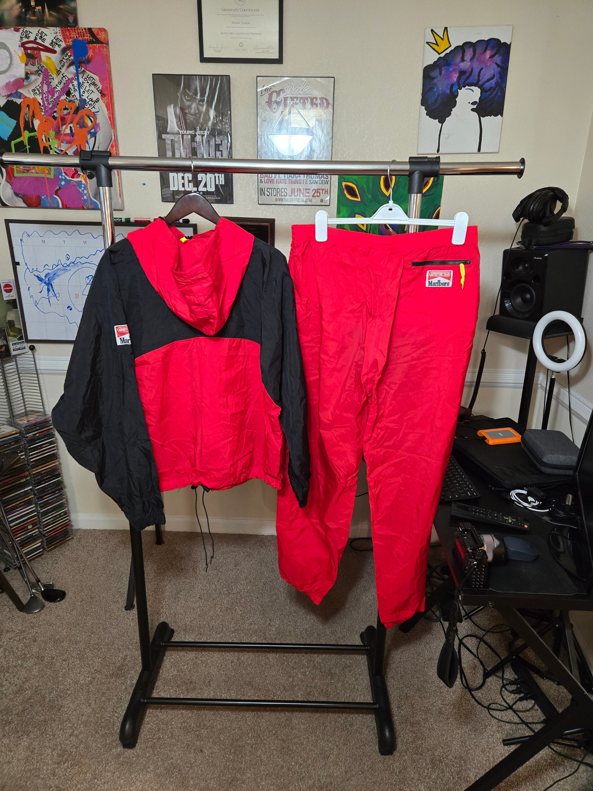 THis is one of those ones, this is a vintage Marlboro Adventure Team rain suit that is available. The sizes are both XL in mens. Very dope piece and they are rolling together.