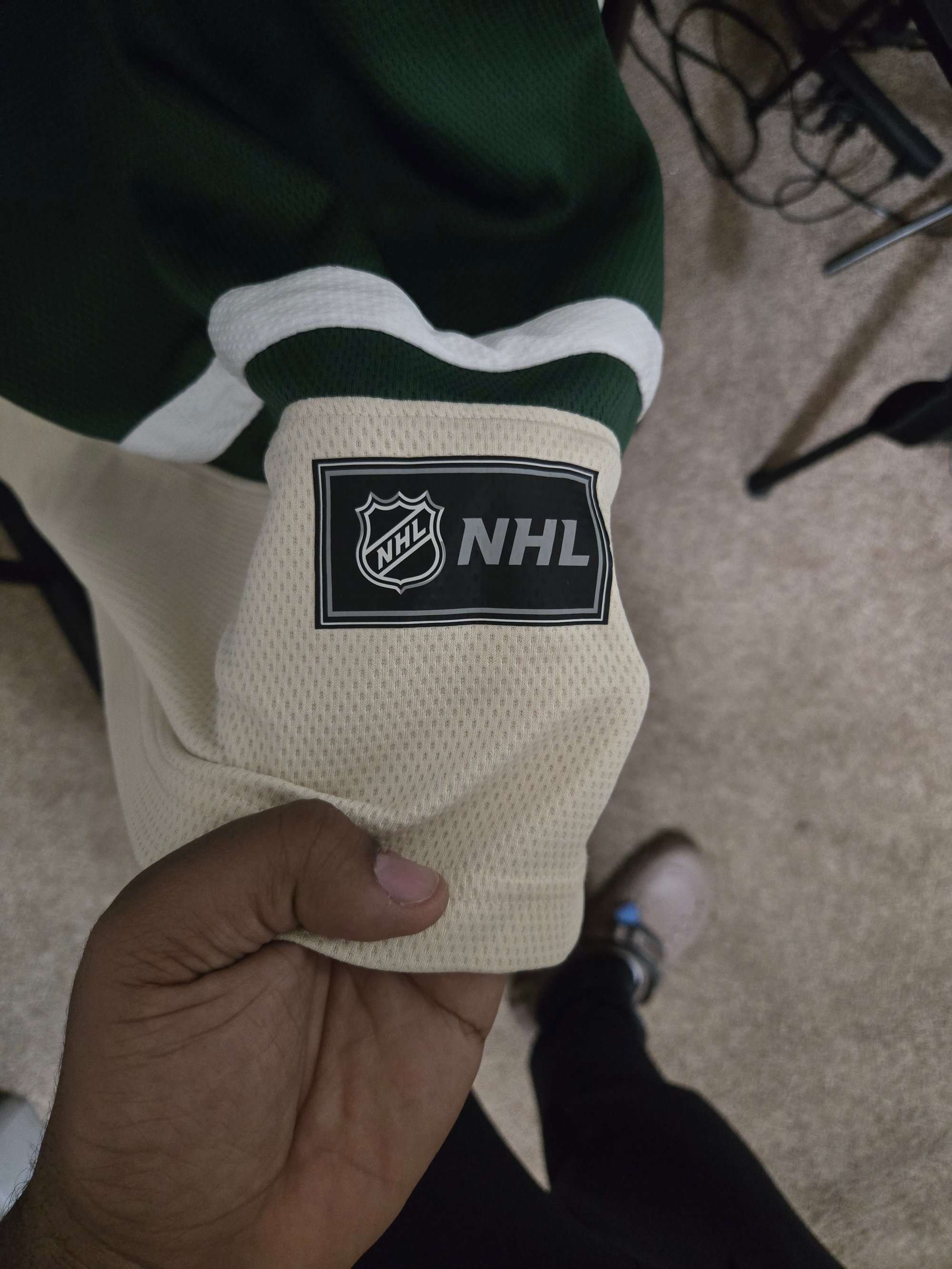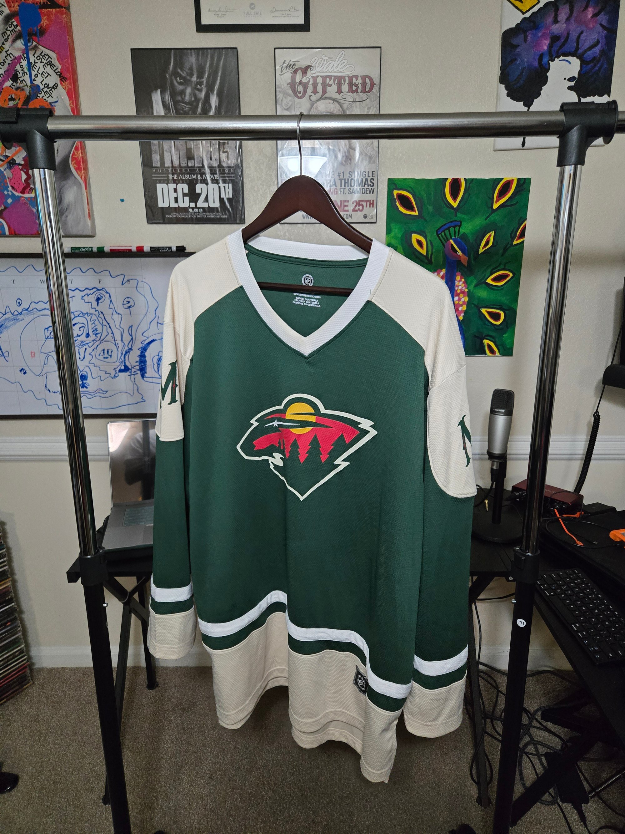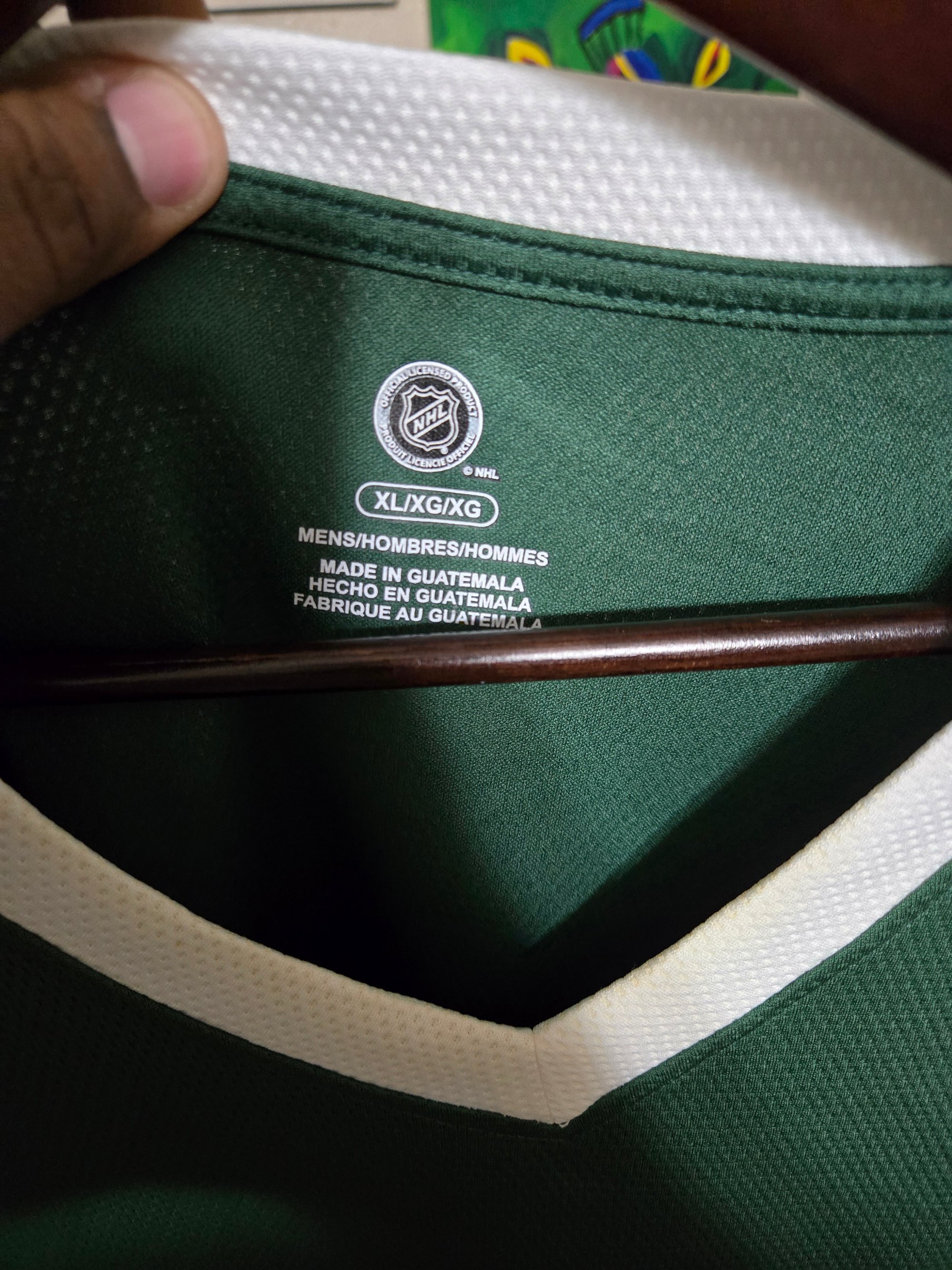 THis is a mens XL jersey without any player info. This is a good pickup for any Minnesota Wild fan.