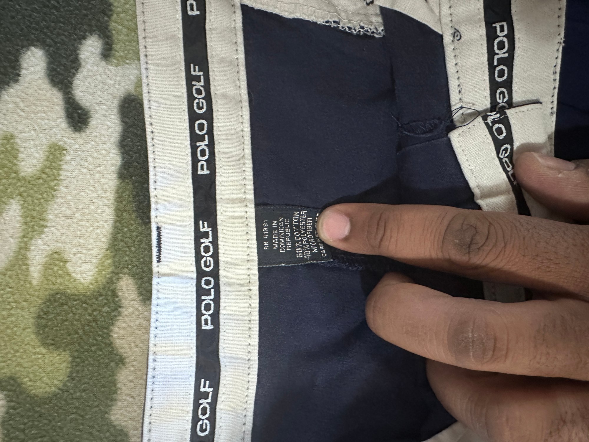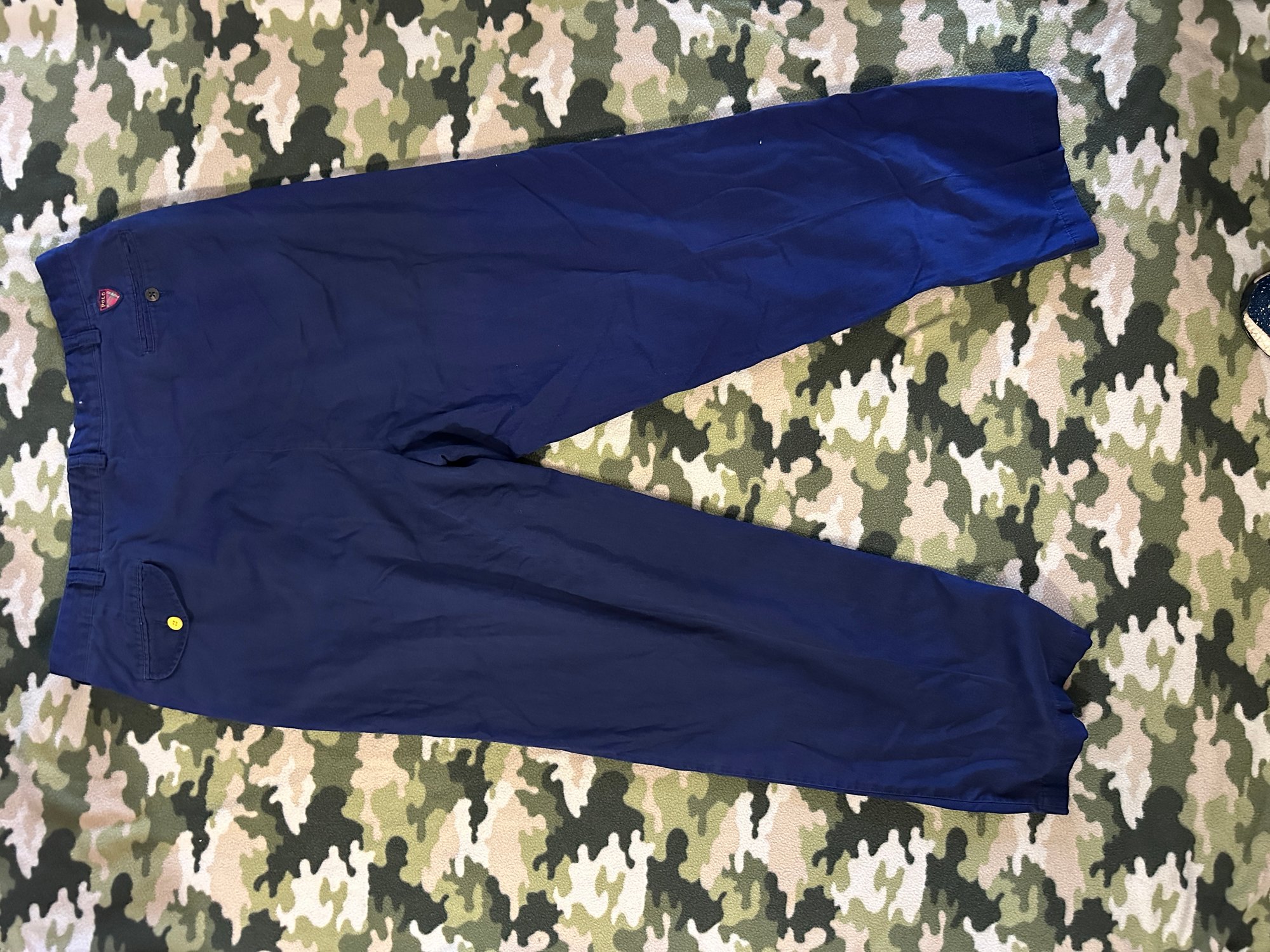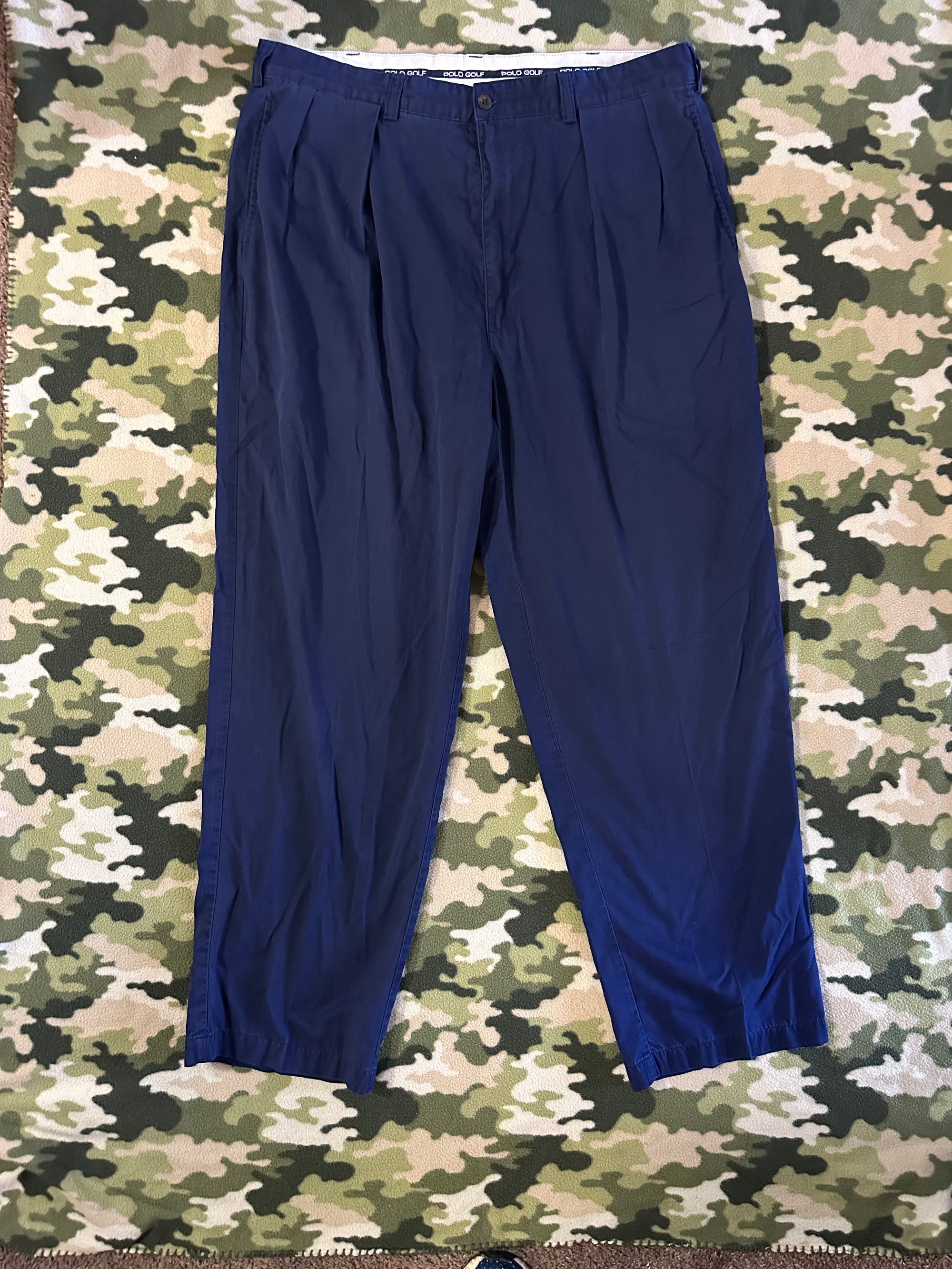 Here are a thrited pair of golf trousers. They are official Polo Golf, tag says 38/32 but they fit a size 34. They are a good pickup and I have added a yellow button where the orignal was missing.
