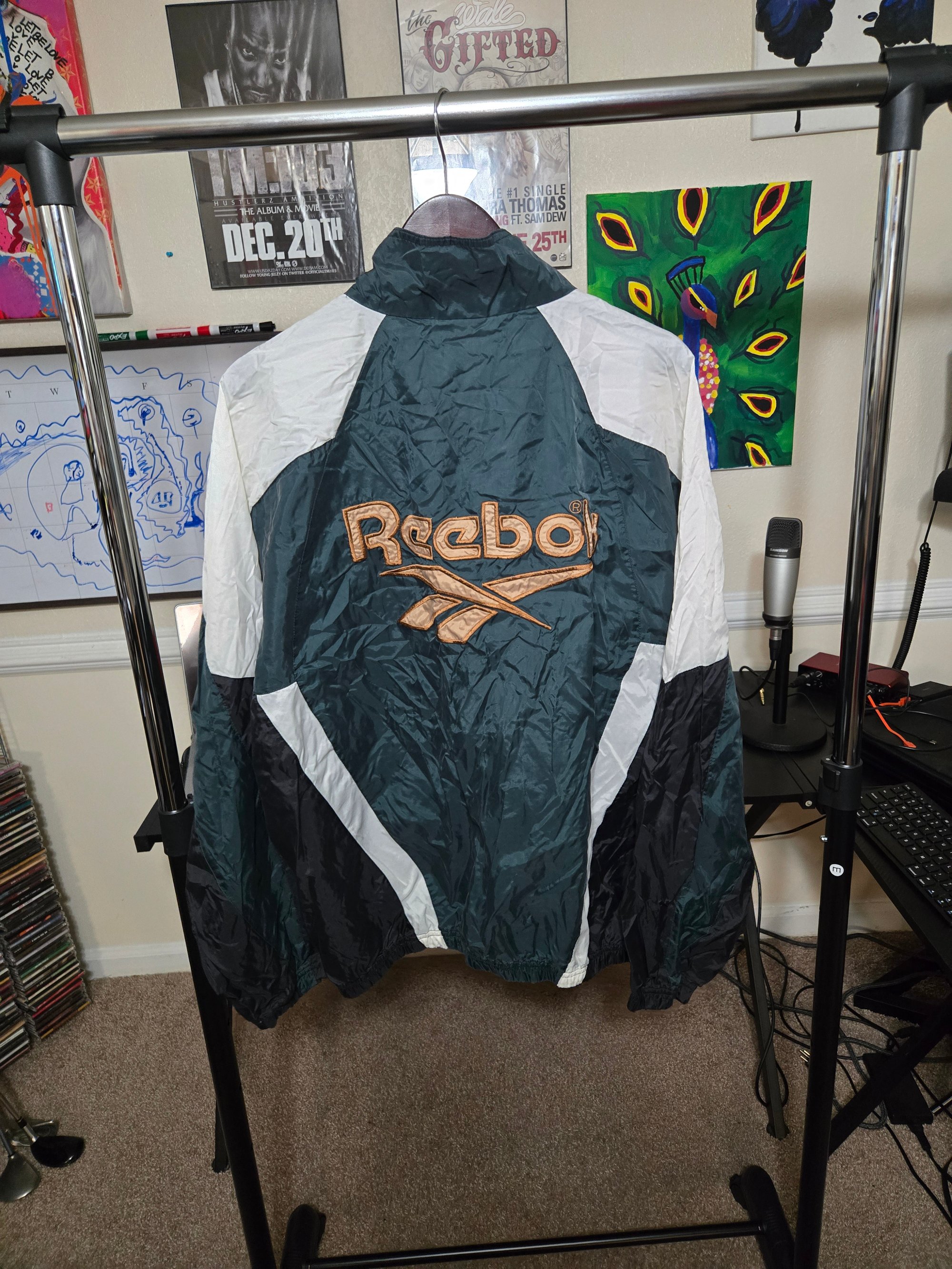 This is a vintage Reebok windbreaker jacket. thin but very stylish. Looks to be from the 90s.